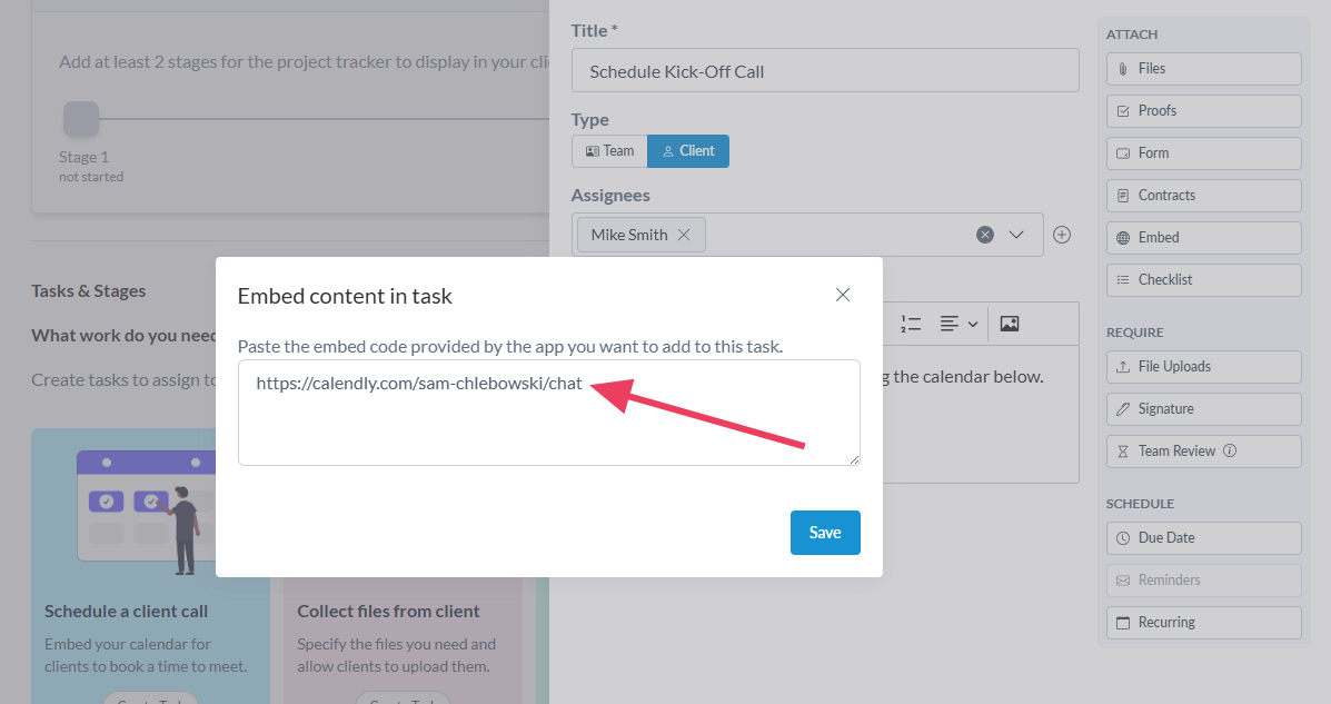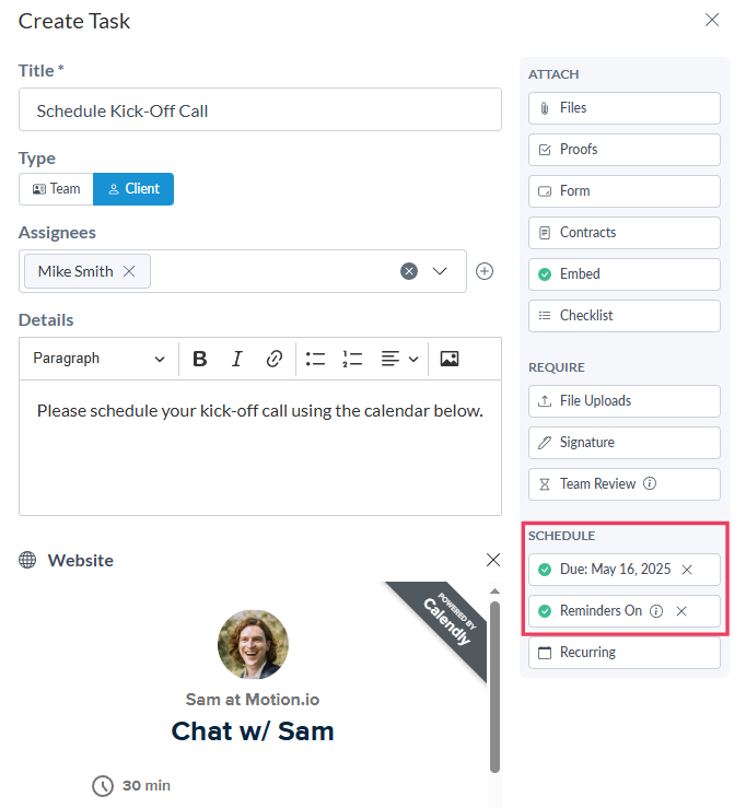 Complete the task details by setting a due date and enabling reminders (to keep clients on track), then click Save.