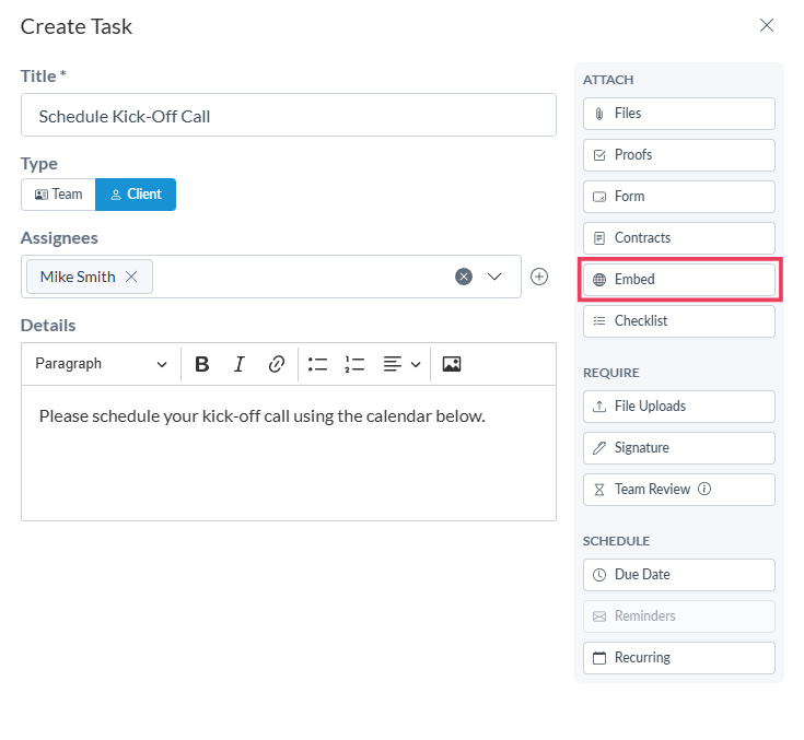 👋Tip: Want to see real-world examples of different ways you can use in Embeds in client tasks? Click here.
