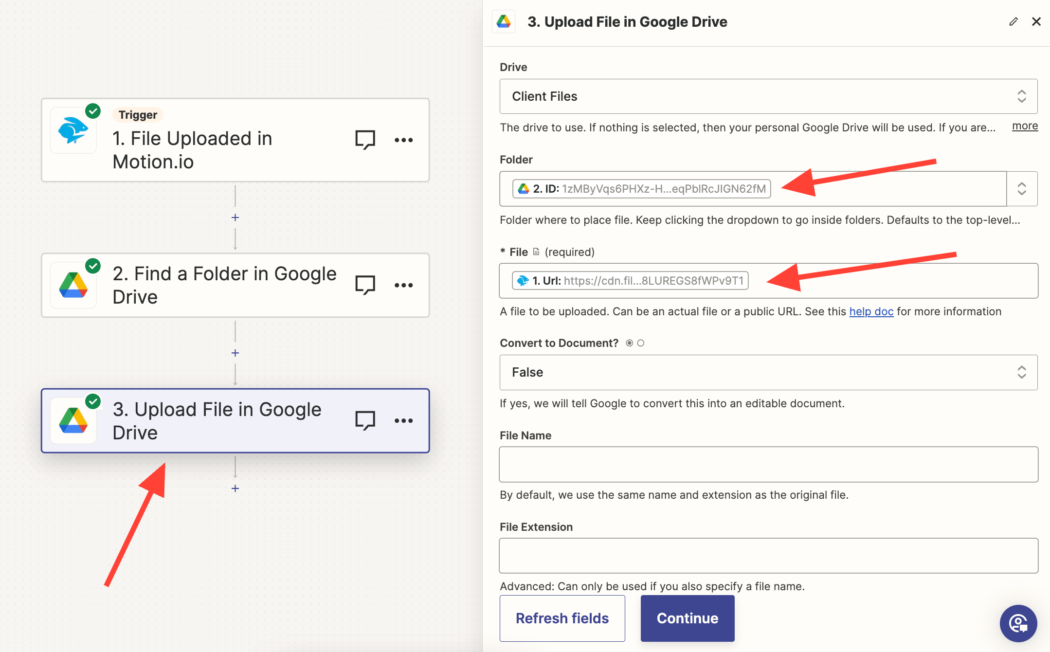 To configure this action, map the "Folder" field to the Google Drive Folder ID Zapier found in the previous action and map the "File" field to the file URL from the Motion.io "File Uploaded Trigger."
