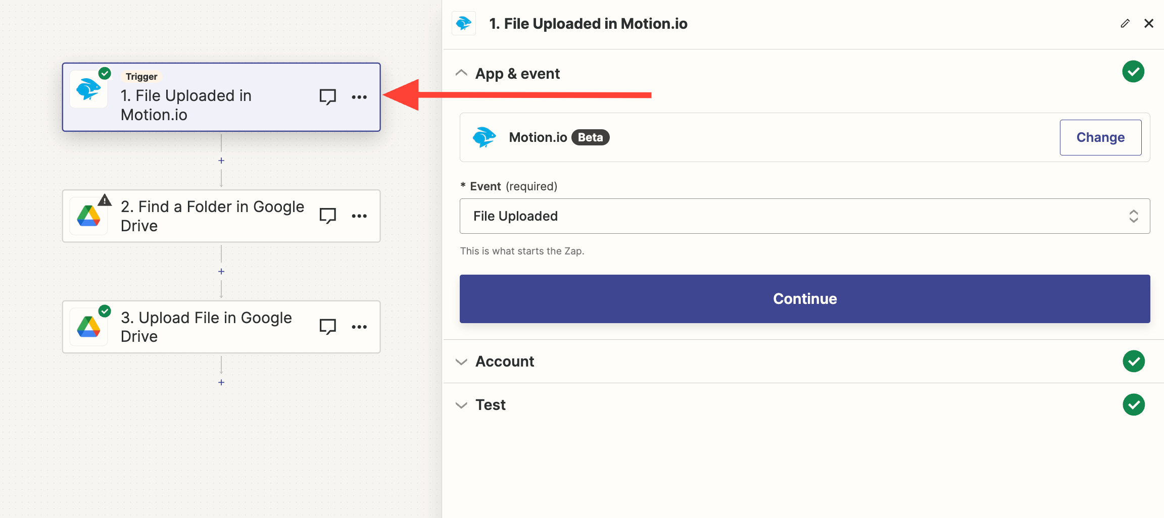 Step 1: Add Motion.io's "File Uploaded" trigger