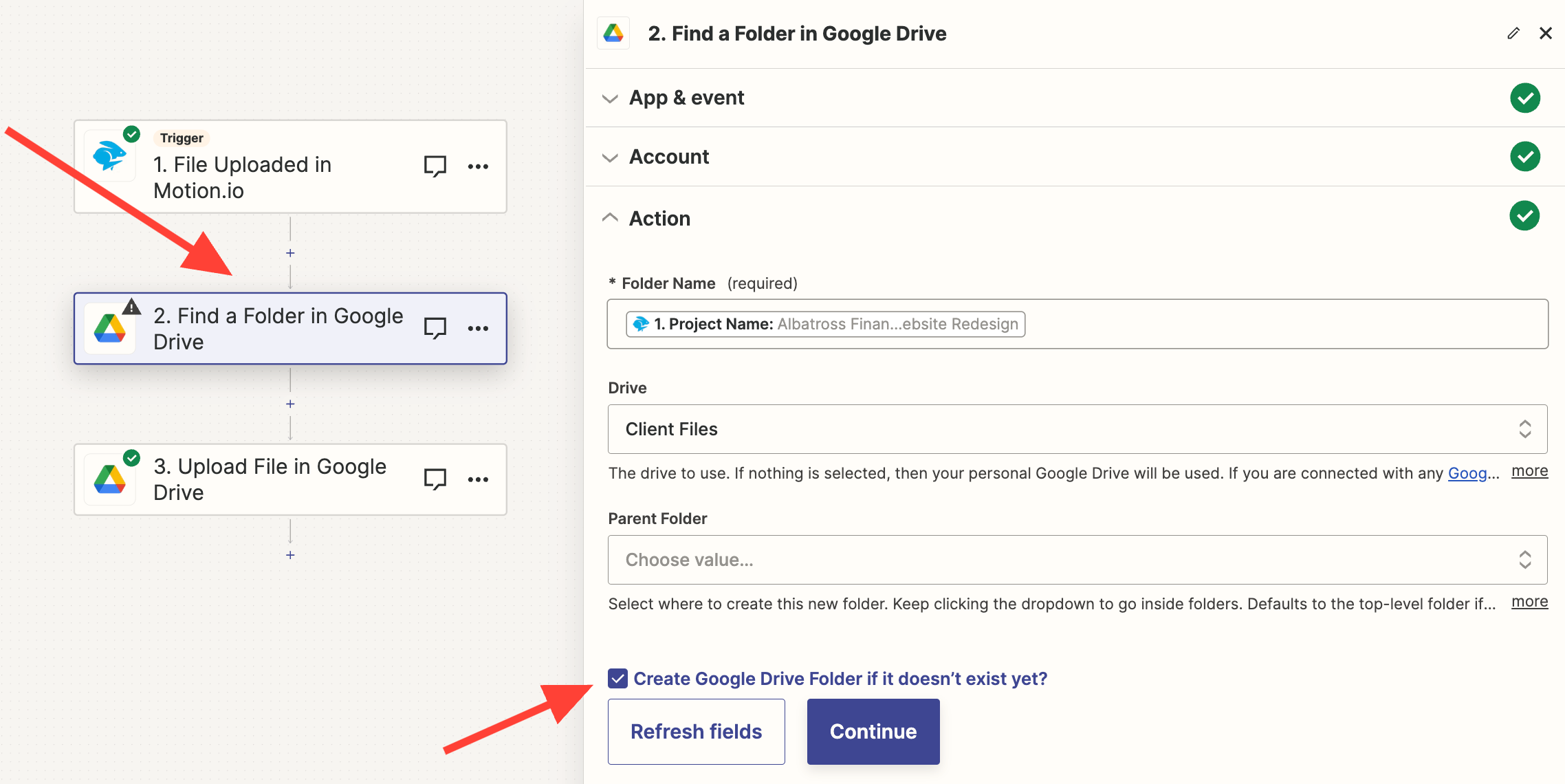 The "Find a Folder" action above utilizes the Motion.io Project Name where the file was uploaded from the trigger to find the corresponding in Google Drive.