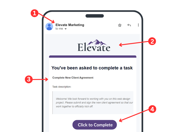 4. Portal link - Depending on what type of notification email was sent, clicking this button will bring clients either to their portal or the specific task you've asked them to complete. By default, the portal link buttons in notification emails use magic links that auto-authenticate clients into their portal without creating an account or remembering a password.