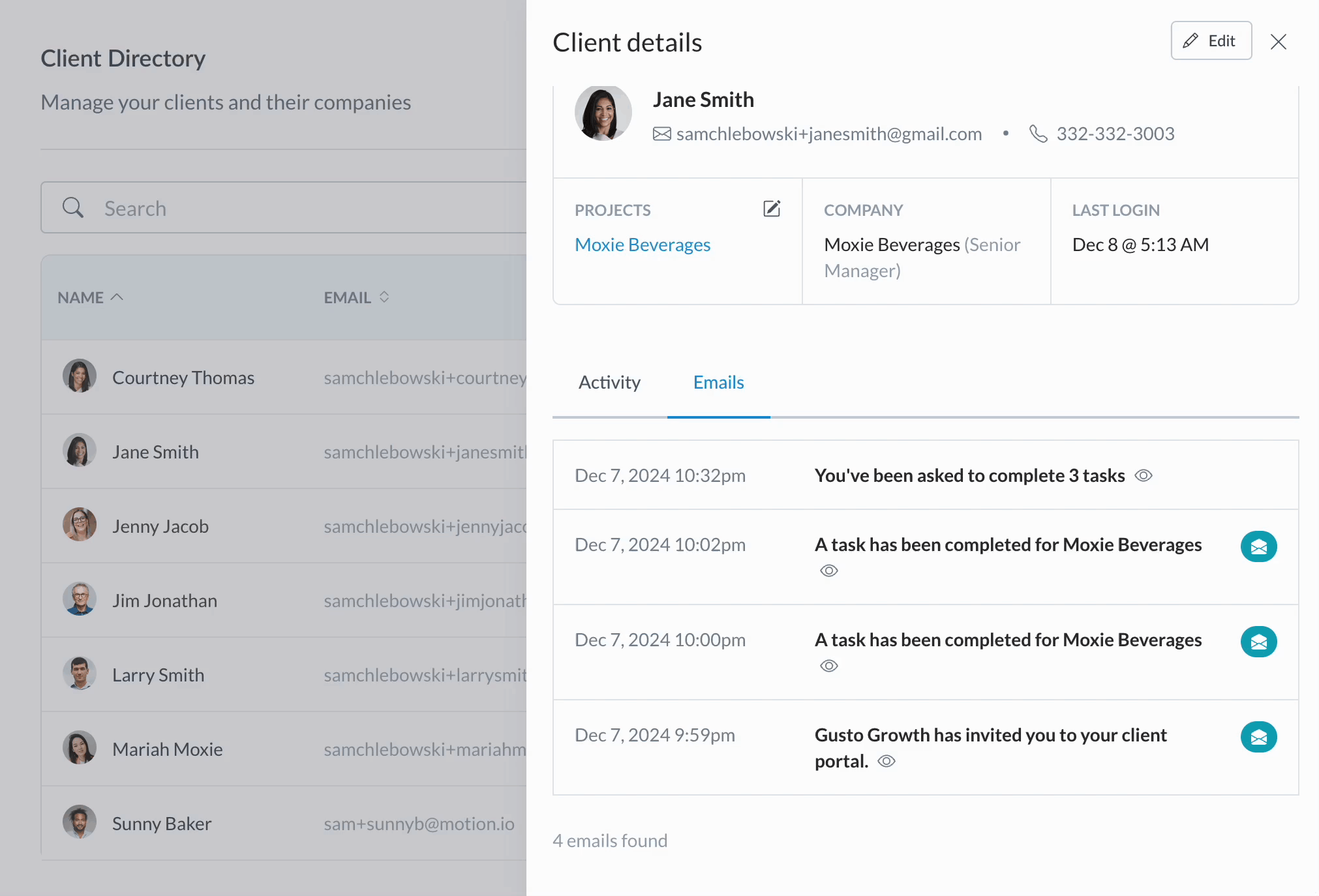 After you invite clients to projects and they begin completing tasks and communicating with your team, the "Email" and "Activity" tabs — which you can access by clicking on a client from the CRM — provide a complete view into how that client has engaged with you and your team.