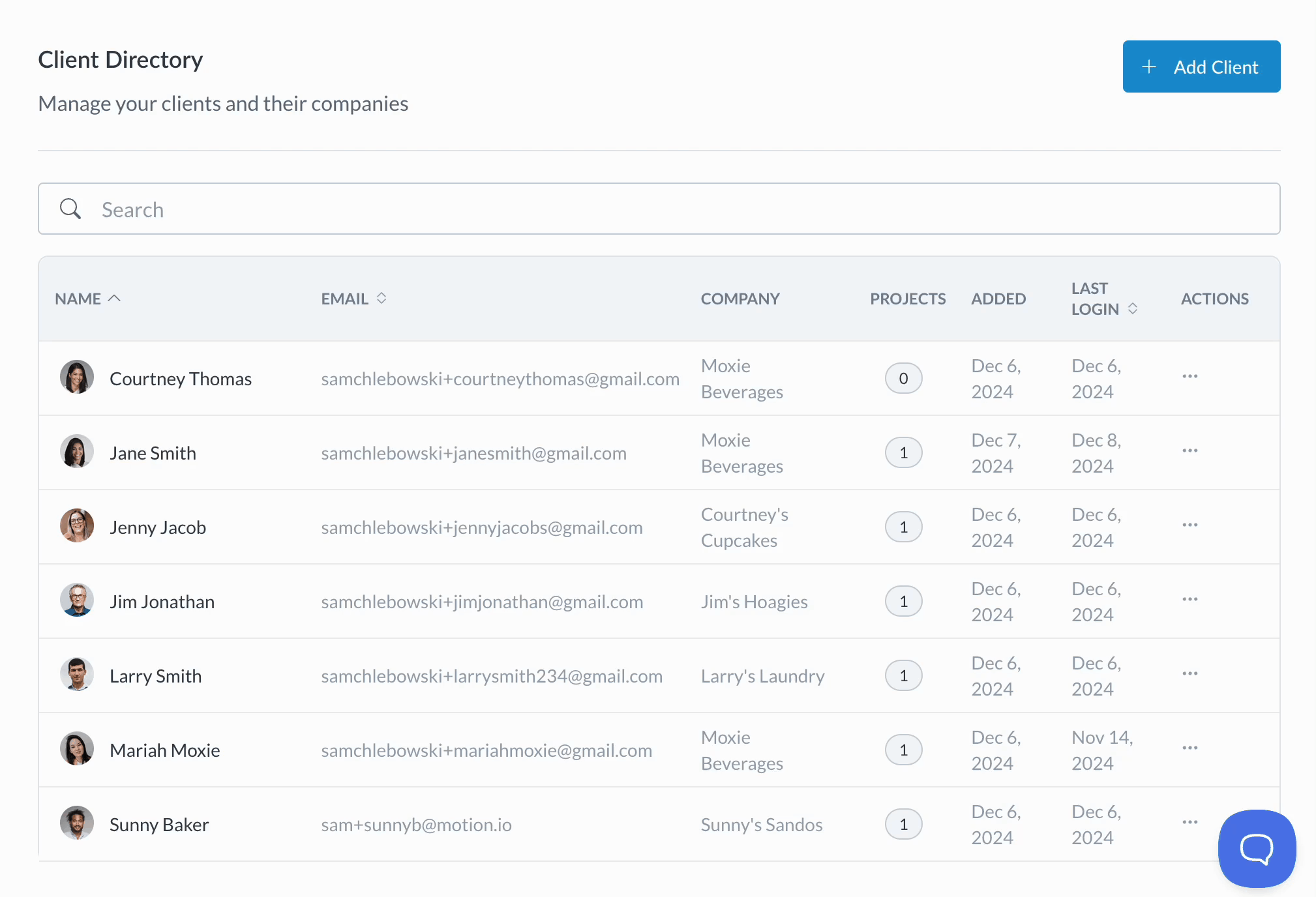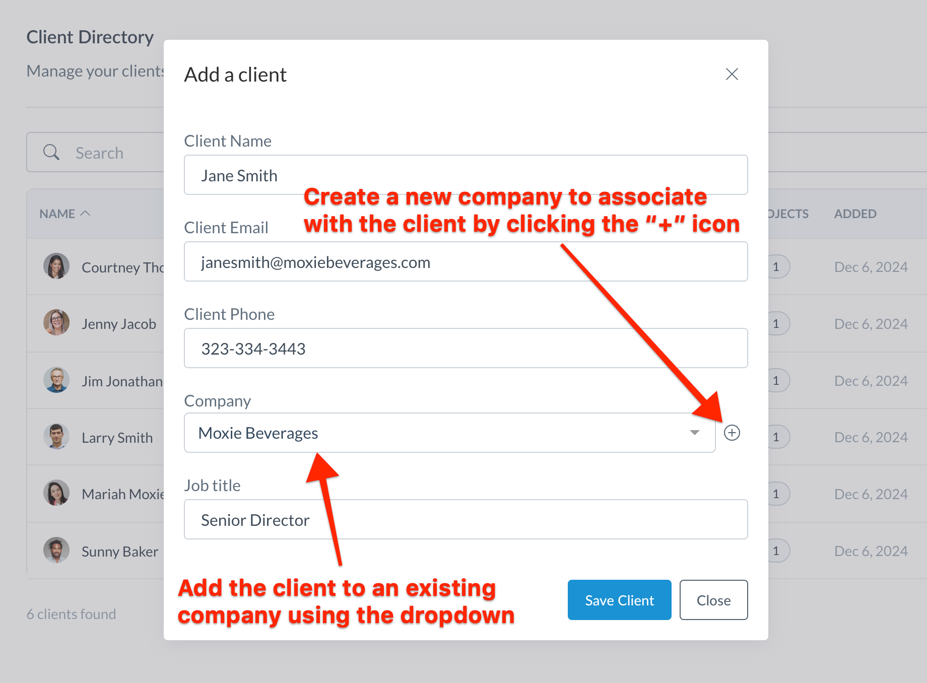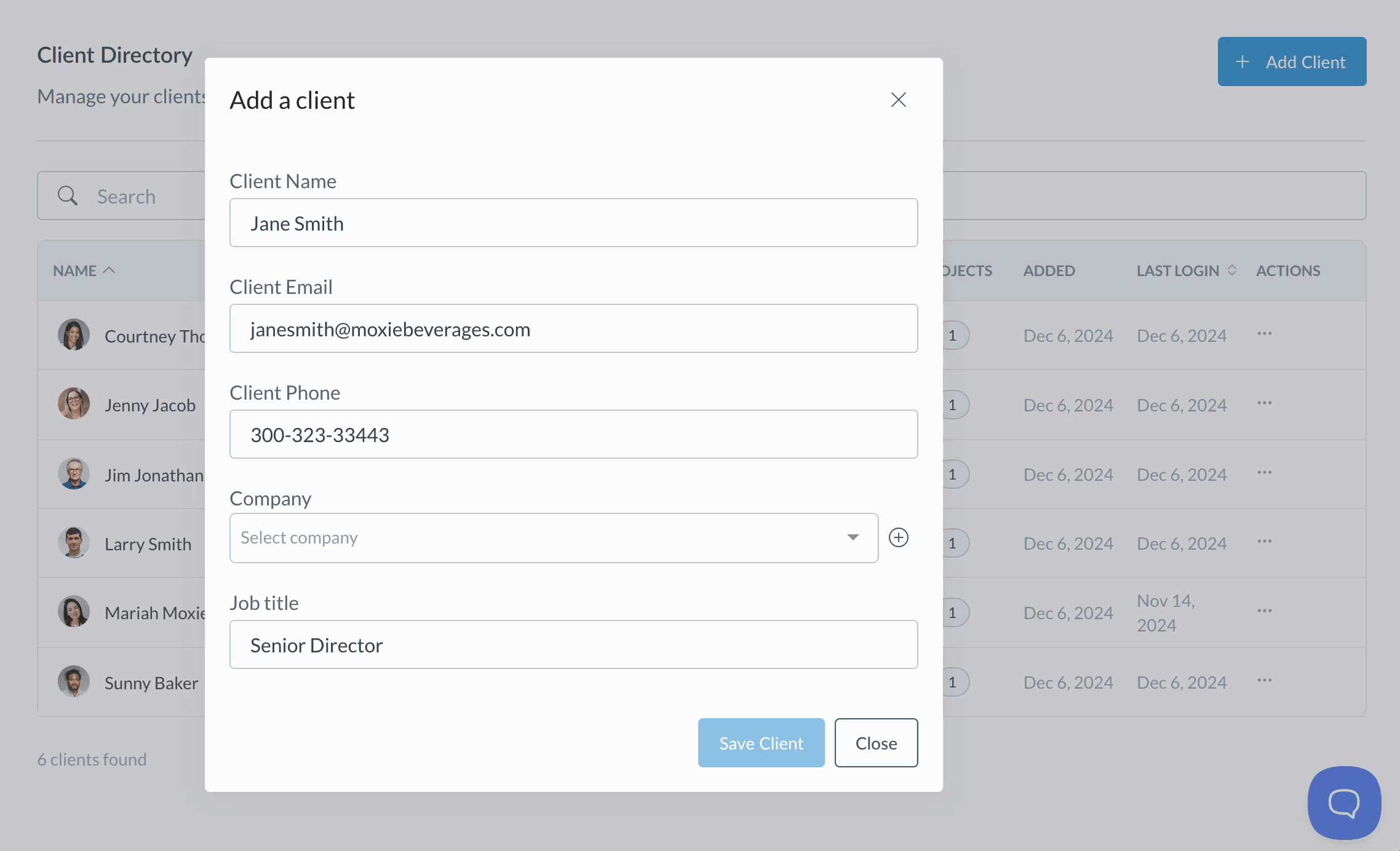 📣 Note: Associating a client with an existing company does not automatically add them to projects other clients in the same company have access to. To give clients access to a project, you must first invite them. The section below explains how to do this.
