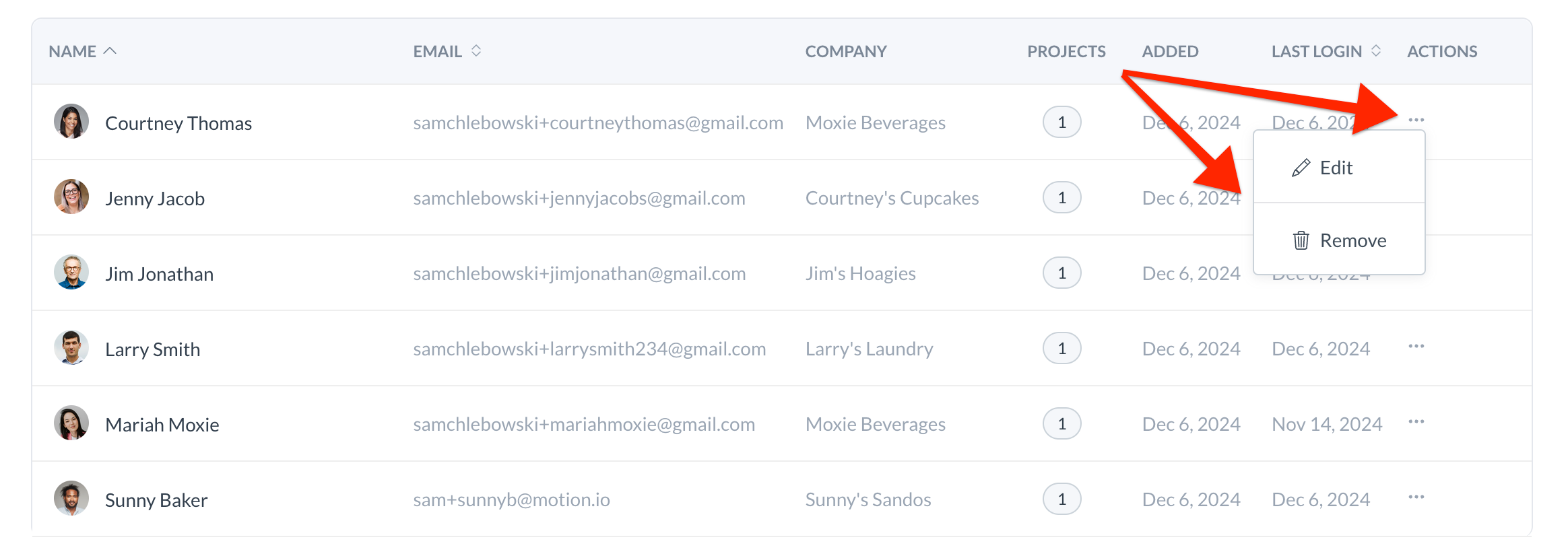 Clicking "Edit" in the dropdown will bring up the exact modal used to create clients and allow you to modify the client's company and title. Clicking the "Remove" action will delete the client from your account, remove them from any projects you invited them to, and make it so they can no longer access their portal.