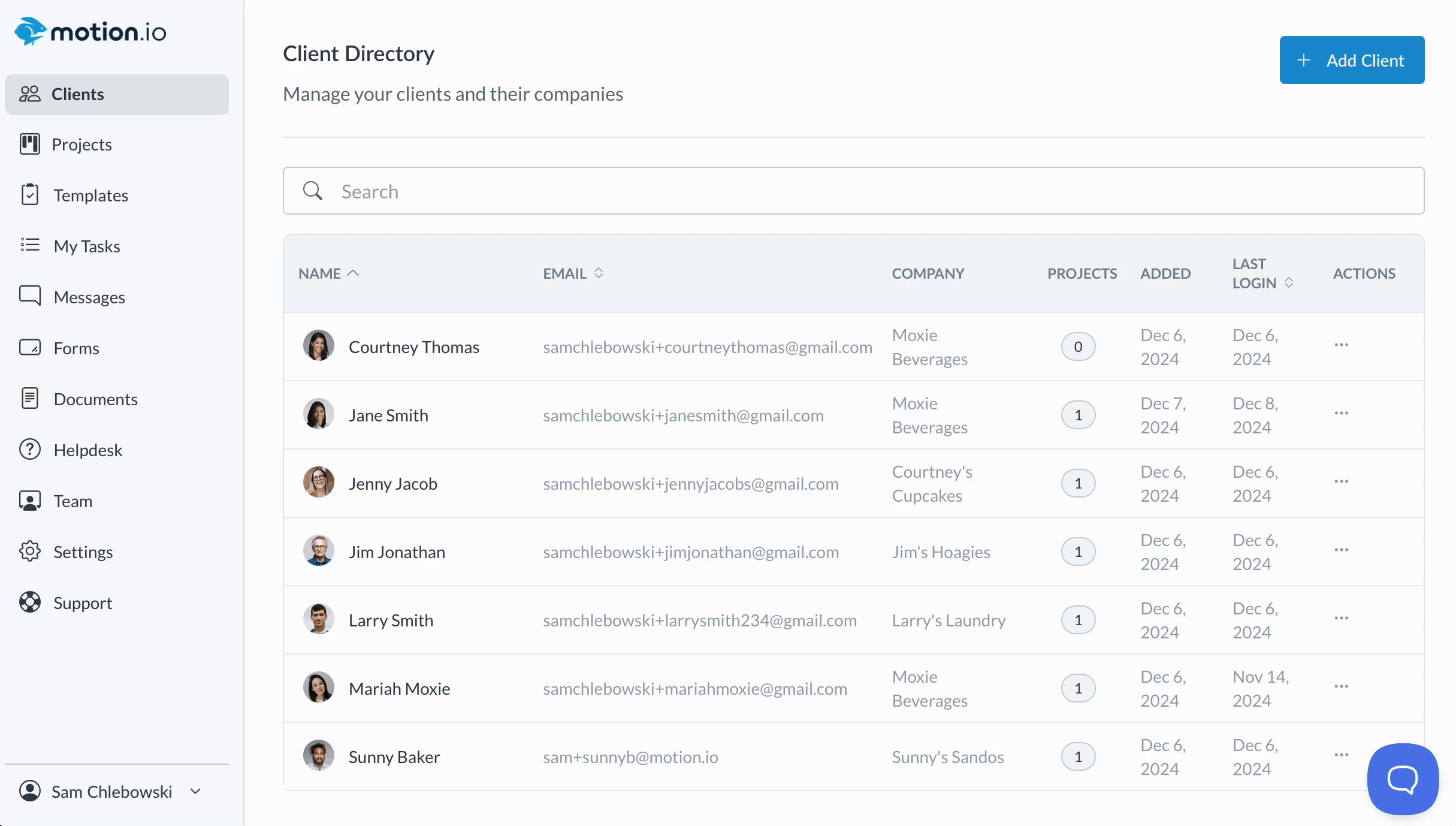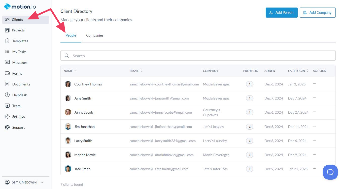 This article will explain how to create and manage people in Motion.io's CRM (also called the "Client Directory") and the information you can access.