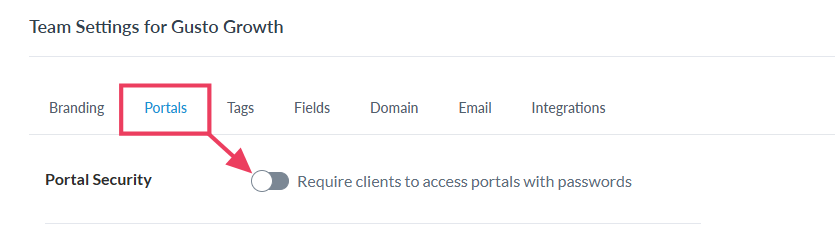 To require clients to enter a password to access their portal, go to Settings on the left, find the Portals tab , and toggle on the "Portal Security" option.
