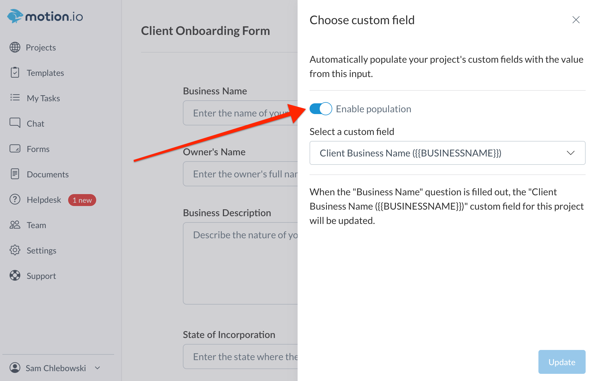 In the slideout on the right side of your screen, click "Enable population" and specify the custom field you'd like to populate with information your clients enter into the field of that form.