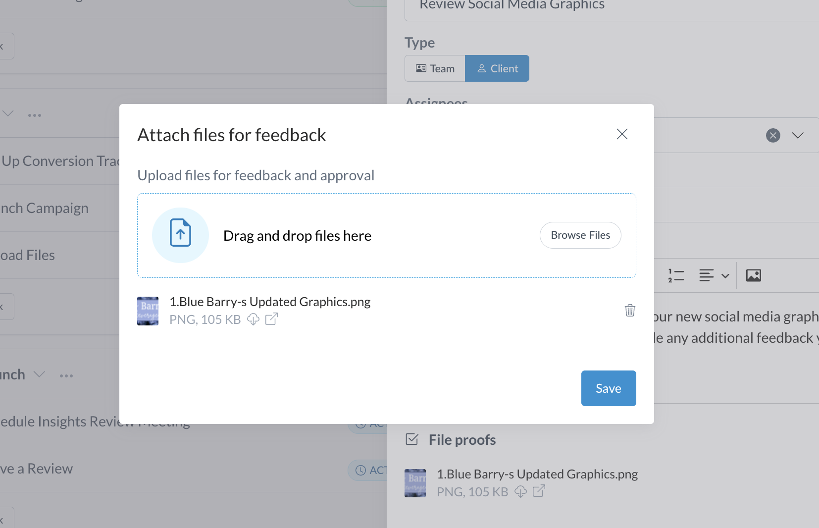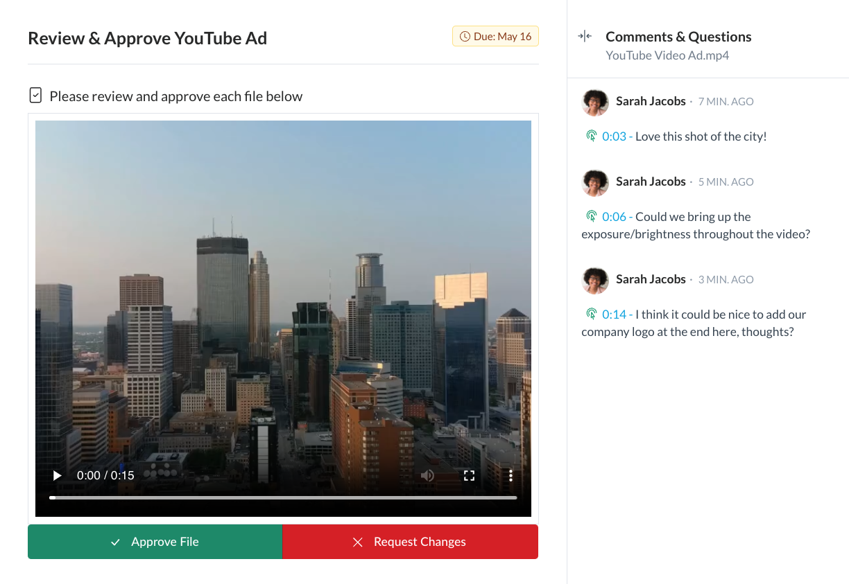 After sending your task, clients can mark files as “Approved” or “Changes Requested,” pinning any comments directly on the files you attached.