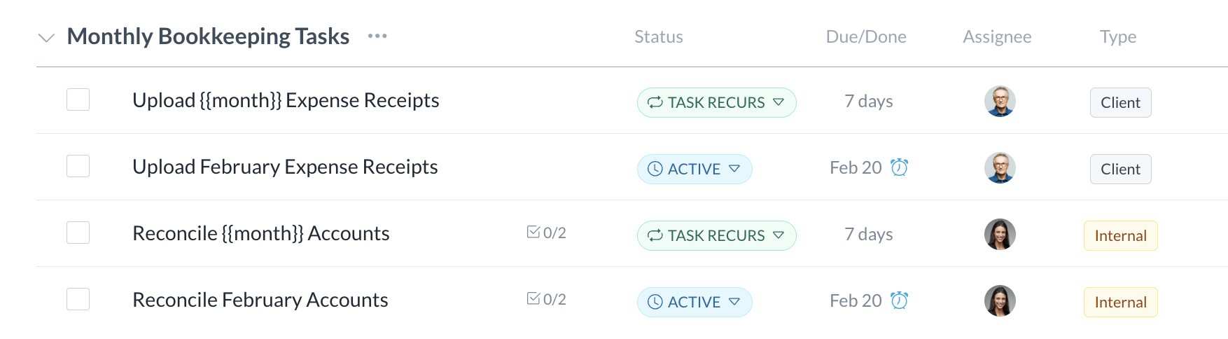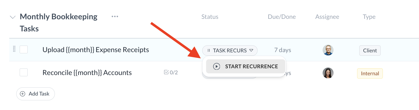 To start a recurring task, click on its status label and select "Start recurrence." After a recurring task is started, it will automatically create duplicate versions of the parent task on the schedule you defined.