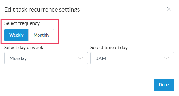 In the modal that opens, you can choose to create either a weekly recurring task (which generates a new task each week) or a monthly recurring task (which generates a new task on a specific day of the month). For weekly tasks, you’ll select the day of the week and time the task should recur. For monthly tasks, you’ll select the date and time it should recur each month.