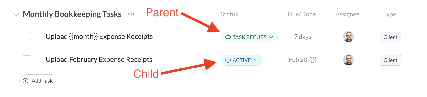 - Child Task: On the schedule you define, a task set to recur will create a duplicate version of itself. These duplicates—or "Children"—are what your client will see when completing a recurring task in their portal and operate identically to all other tasks in Motion.io.