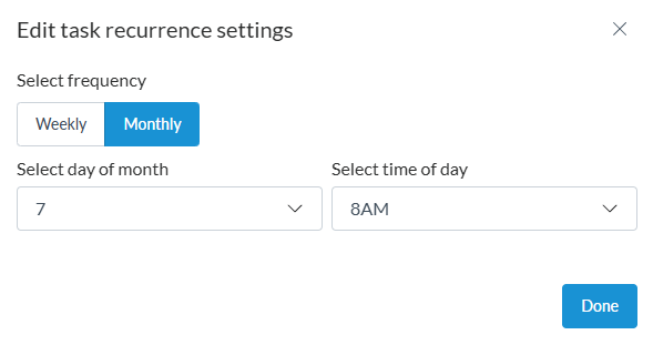 For weekly tasks, you’ll select the day of the week and time the task should recur. For monthly tasks, you’ll select the date and time it should recur each month.