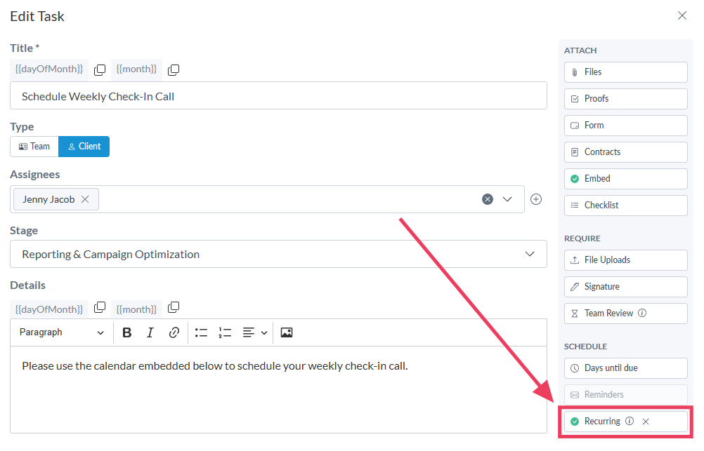 Motion.io’s Task Composer lets you create both recurring client tasks and recurring team tasks. To create one, open a project or template, navigate to the Tasks page, and click the Create Task button. In the task composer, scroll to the bottom of the task options and select the Recurring option to configure how often the task repeats.