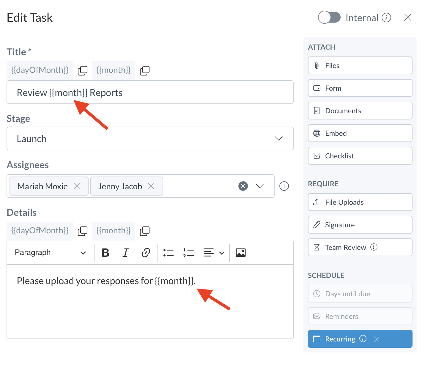 After starting a recurring task, Motion.io will create duplicate versions of it on the schedule you define. To help your team and clients clearly distinguish between a recurring task assigned in the current month vs. the previous month, you can use the bracketed text fields — and — to automatically populate that information in the task's title and description.