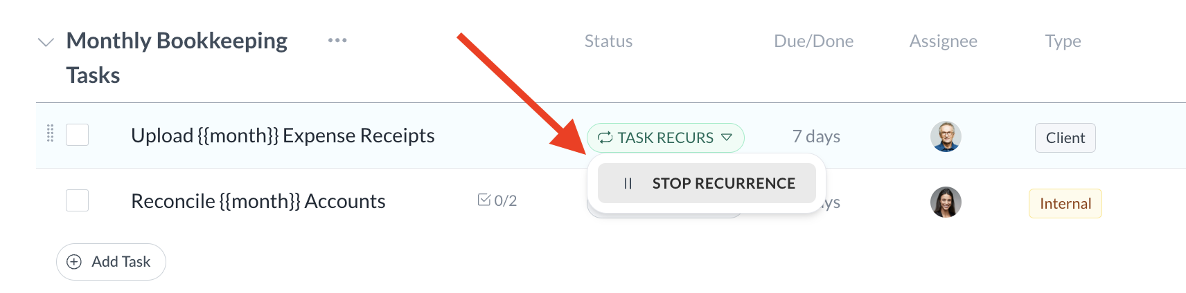 To stop a recurring task, click on its status label and select "Stop recurrence." Once a recurring task is stopped, no new child tasks will be created.