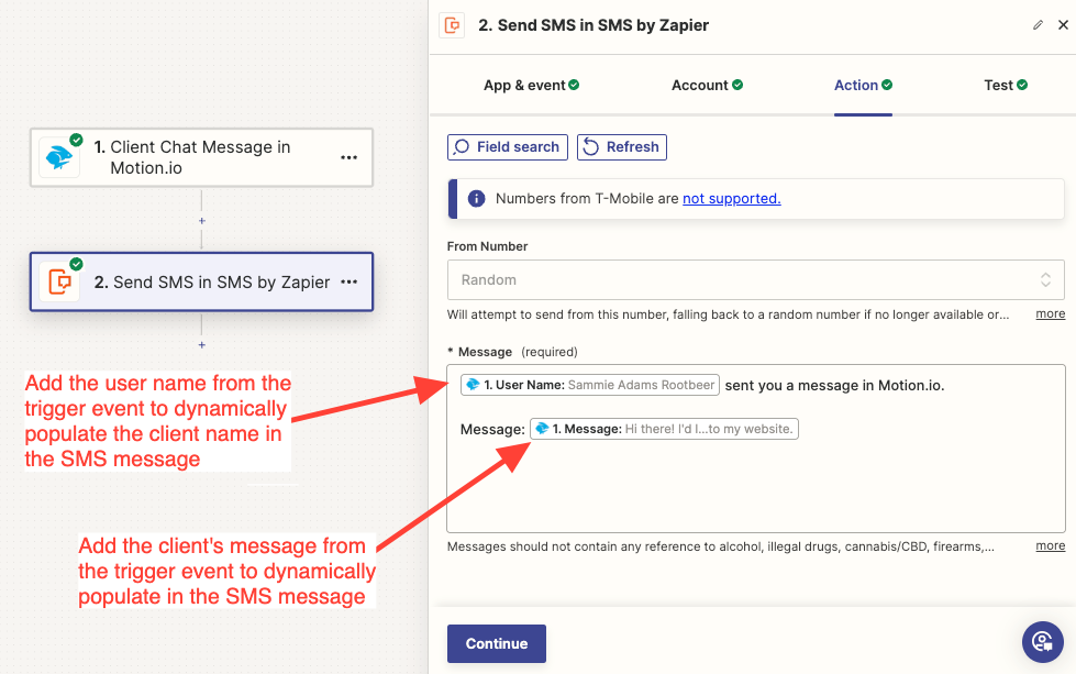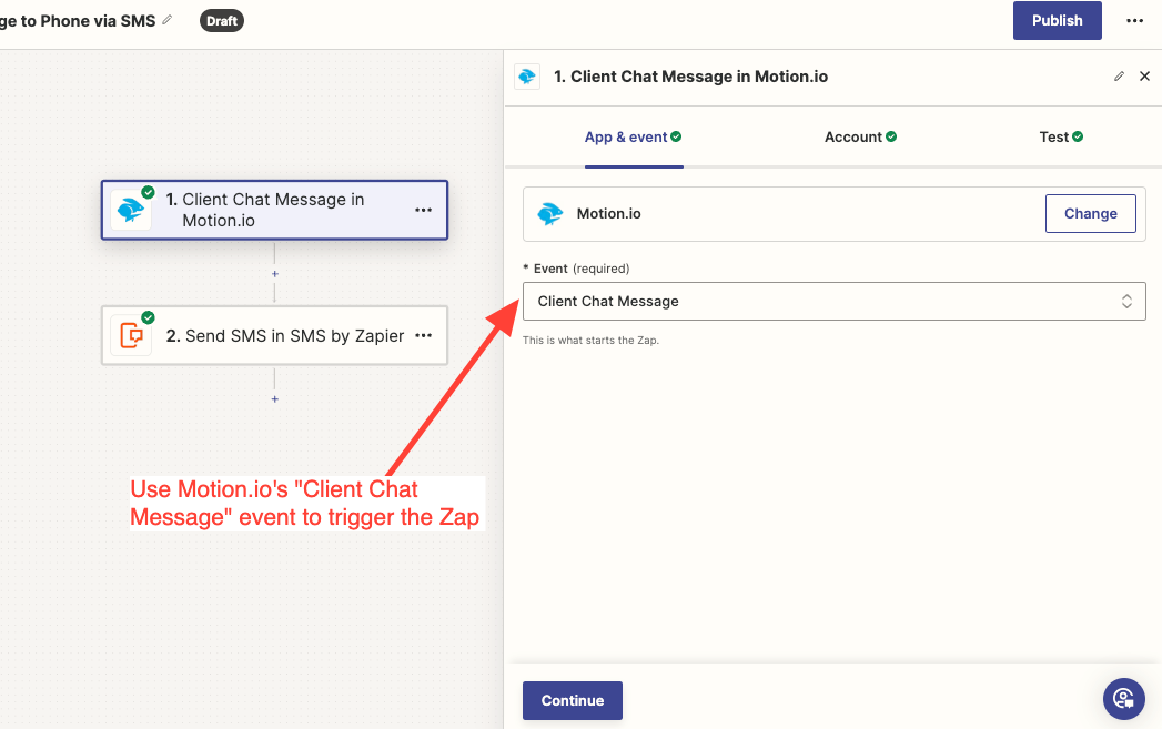 The example in the screenshots below is for a Zap that automatically sends an SMS notification to a team member's phone whenever there is a new chat message in a Motion.io client portal.