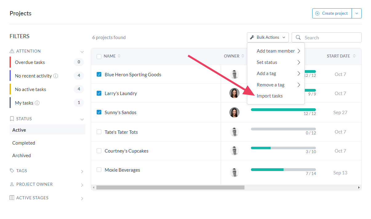 Select "Projects" from the left sidebar to open your Project Dashboard. In the dashboard, click the checkbox on the left side of each project you want to include and select "Import tasks" from the "Bulk Actions" dropdown.