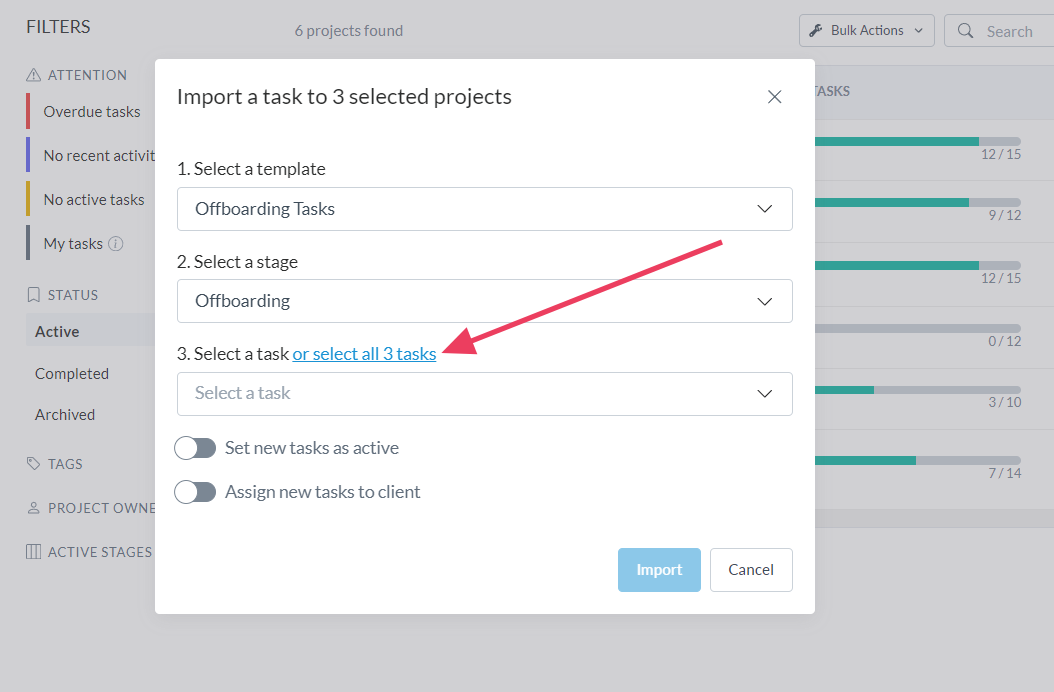 In your Projects Dashboard, the "Import Tasks" bulk action enables you to bring in select tasks (or entire project stages) from any of your Motion.io templates, assign them to clients, and send them to multiple projects simultaneously.