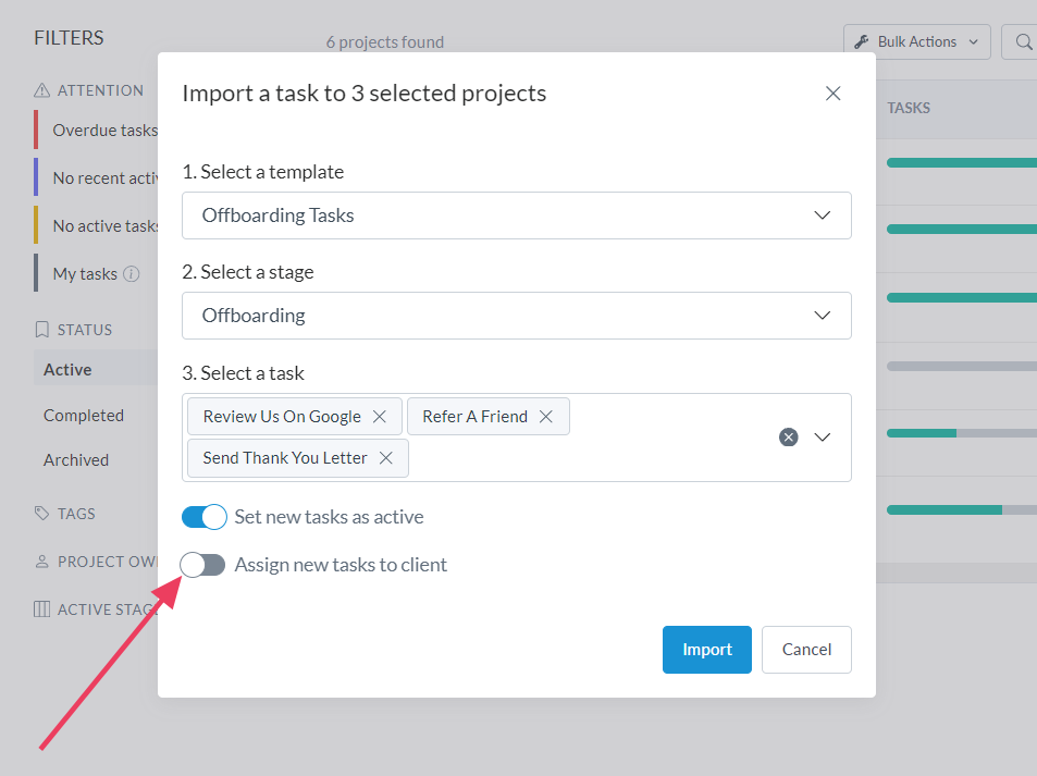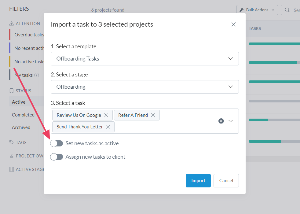 Sending tasks changes their status to "Active" and enables clients to view and complete them in their portals. To automatically send the tasks you are importing and make them accessible to clients, click the toggle labeled "Set new tasks to active."