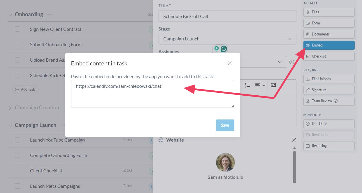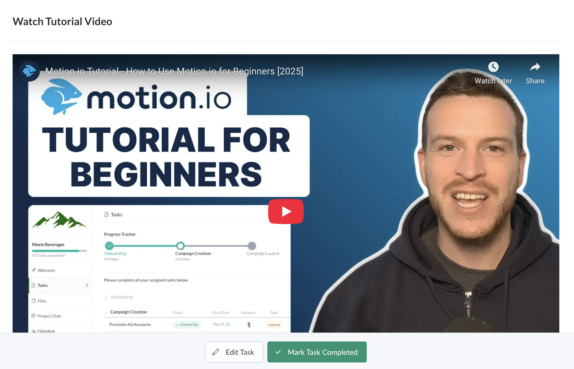 Embed videos from streaming platforms like YouTube and Vimeo clients can watch directly within client tasks.