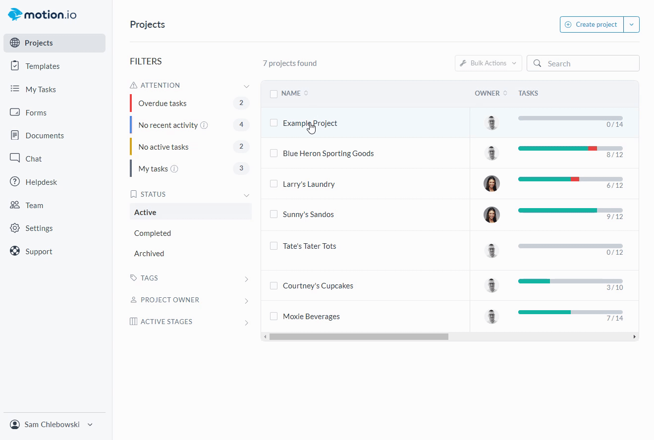 In scenarios where clients complete tasks outside of Motion.io (or forget to click "Complete" in their portals), you and your team members can do so for them. To change a group of tasks to the "Completed" status, click the check box and select the "Mark Completed" option from the "Bulk Actions" dropdown.