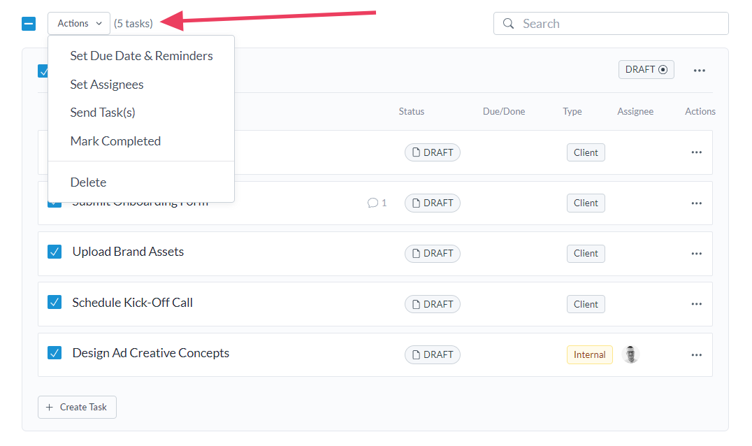 To bulk set assignees for multiple tasks at once, select the tasks you would like to assign by clicking the checkbox and select "Set Assignees" from the bulk actions dropdown. In the modal, choose the clients (or team members, if you've selected internal tasks) you want to assign, and click "Save."