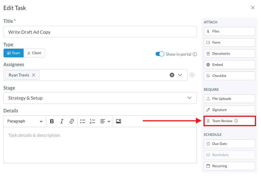 When creating a team task, you have the option to require a team review before the task is marked as complete. You can assign a reviewer from your team during Task creation or editing.