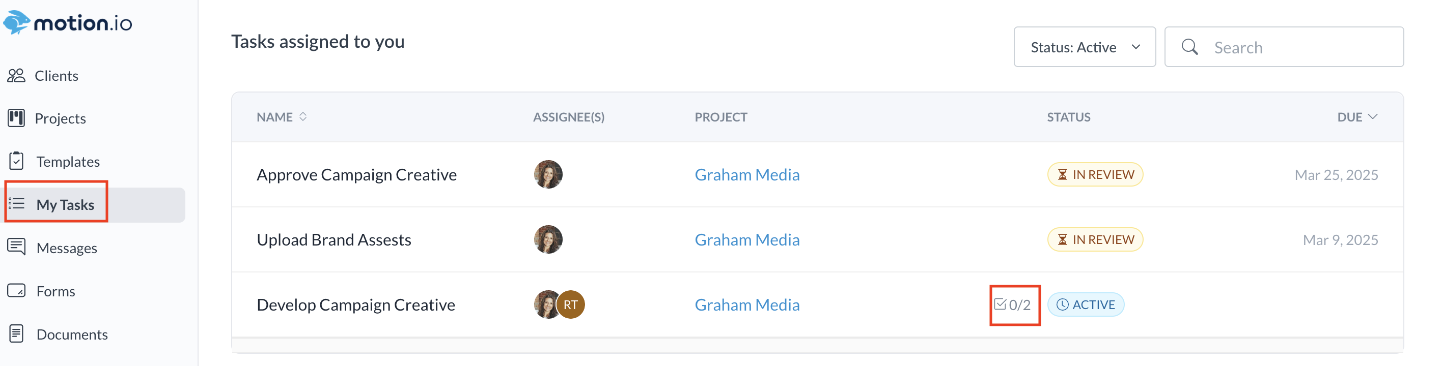 The Tasks with a small checkbox and numbers next to the status means subtasks are built in. By clicking on that Task, you can see all the subtasks, assignees, due dates, and messages. Here is where you can mark off your completed subtasks or leave a comment that's only visible internally.
