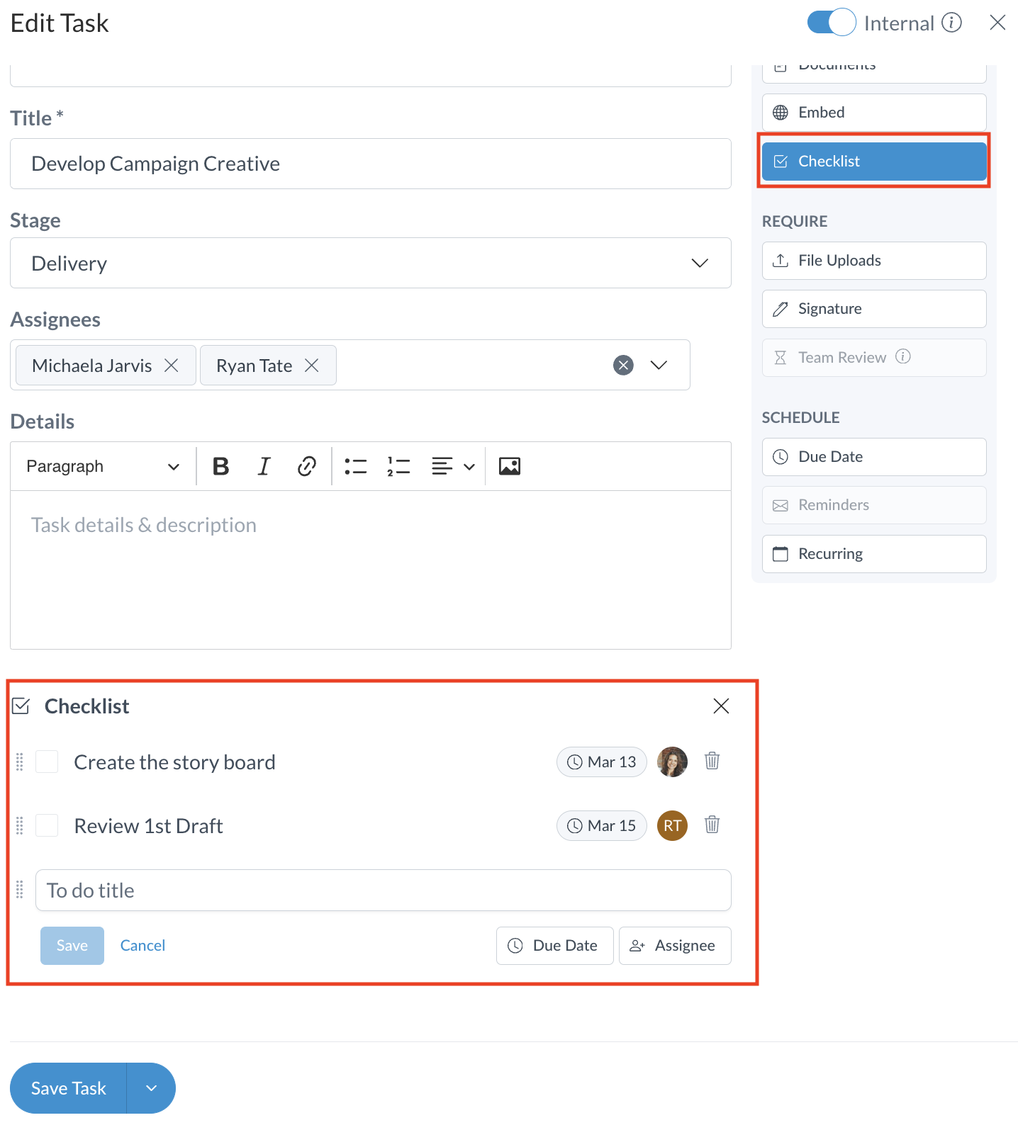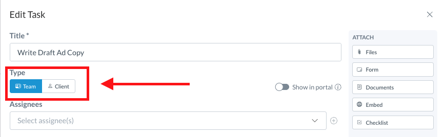 Click on "Checklist" under "Attachments" allows you to create a "to-do" list within a Task. When creating subtasks, you can assign them to specific team members and add individual due dates for each. Clients will not have visibility into Team Task Checklists.