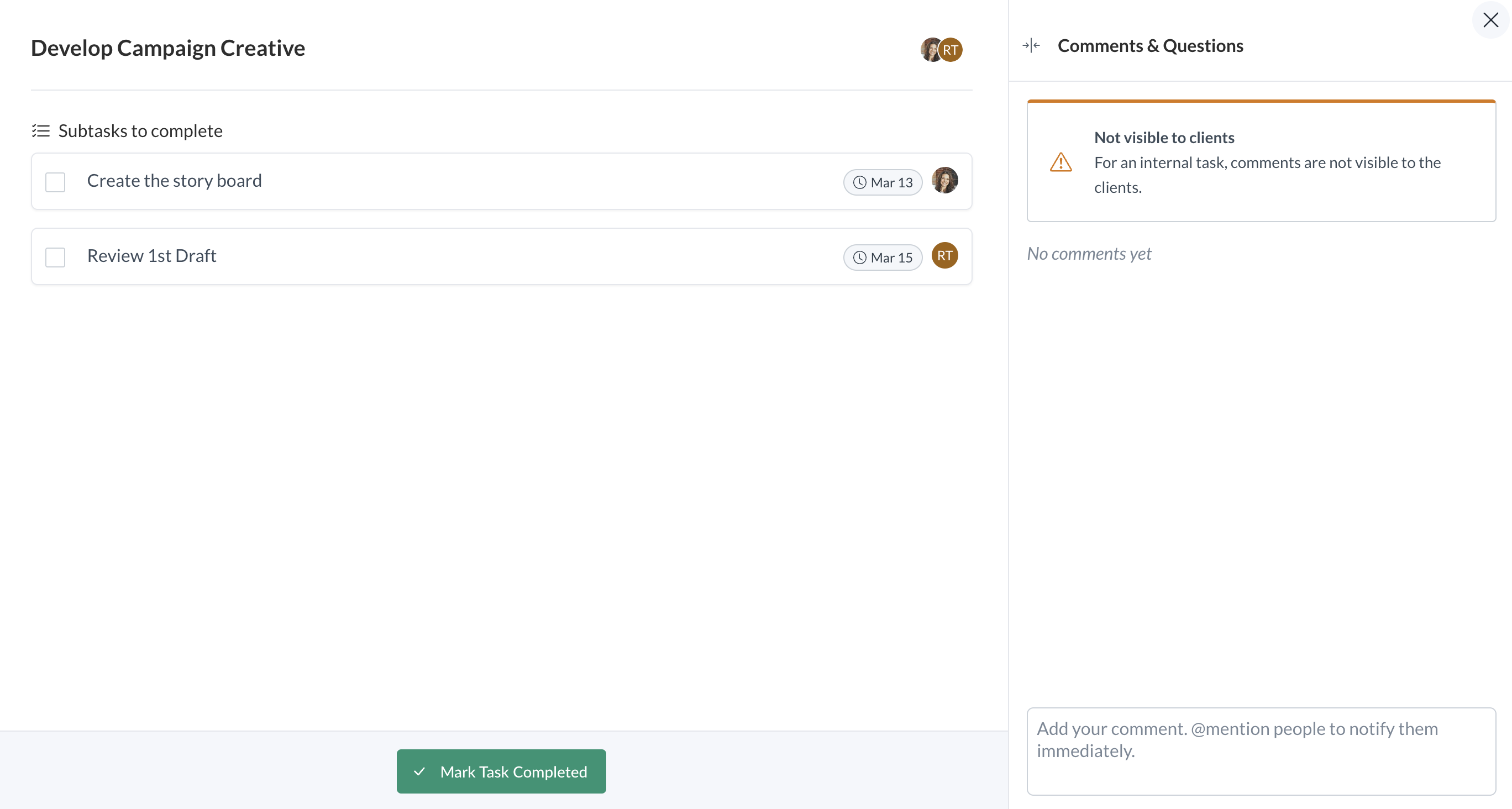 Like Client Tasks, your team can create Team Tasks in active projects and project templates. However, unlike Client Tasks, you can only assign Team Tasks to your own team members. To assign team members to tasks, you must first add them to the project.