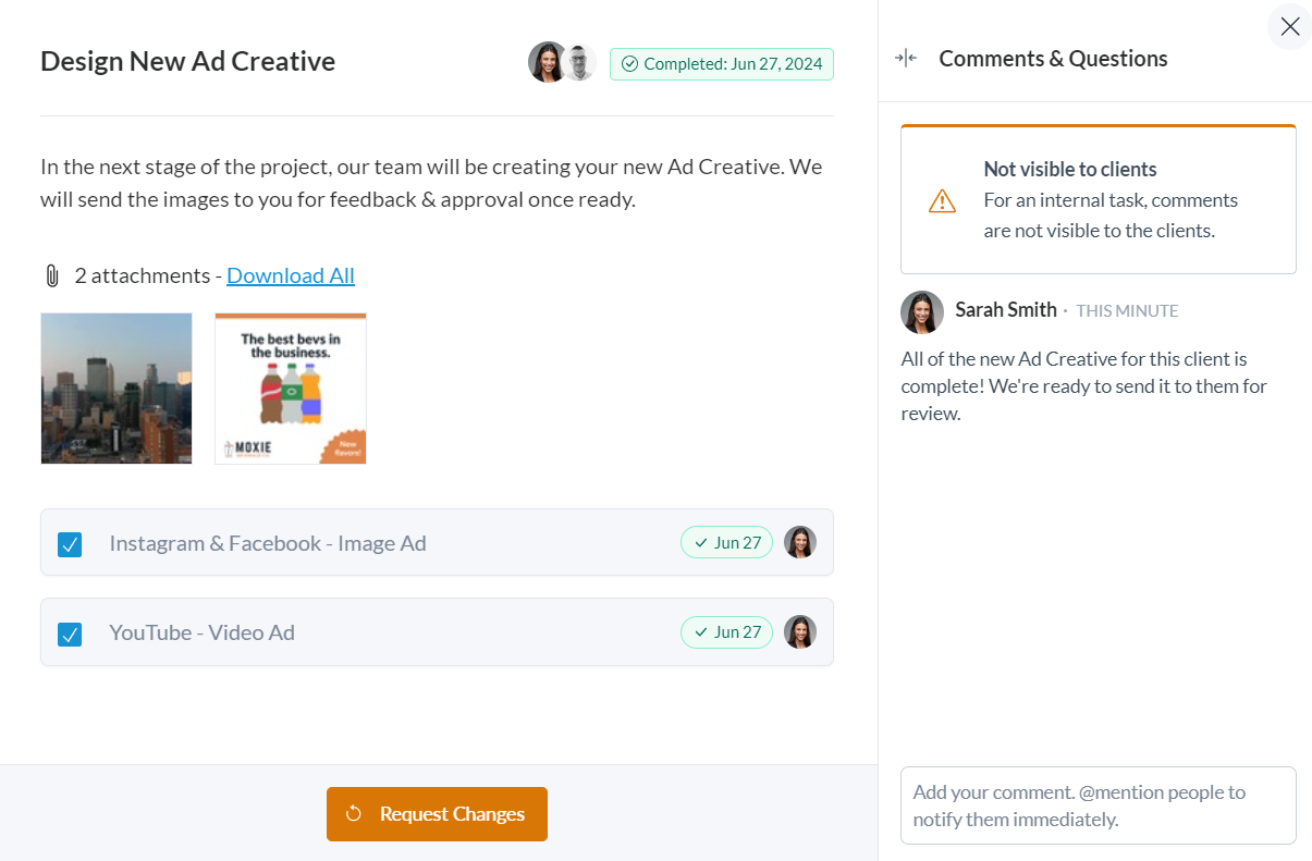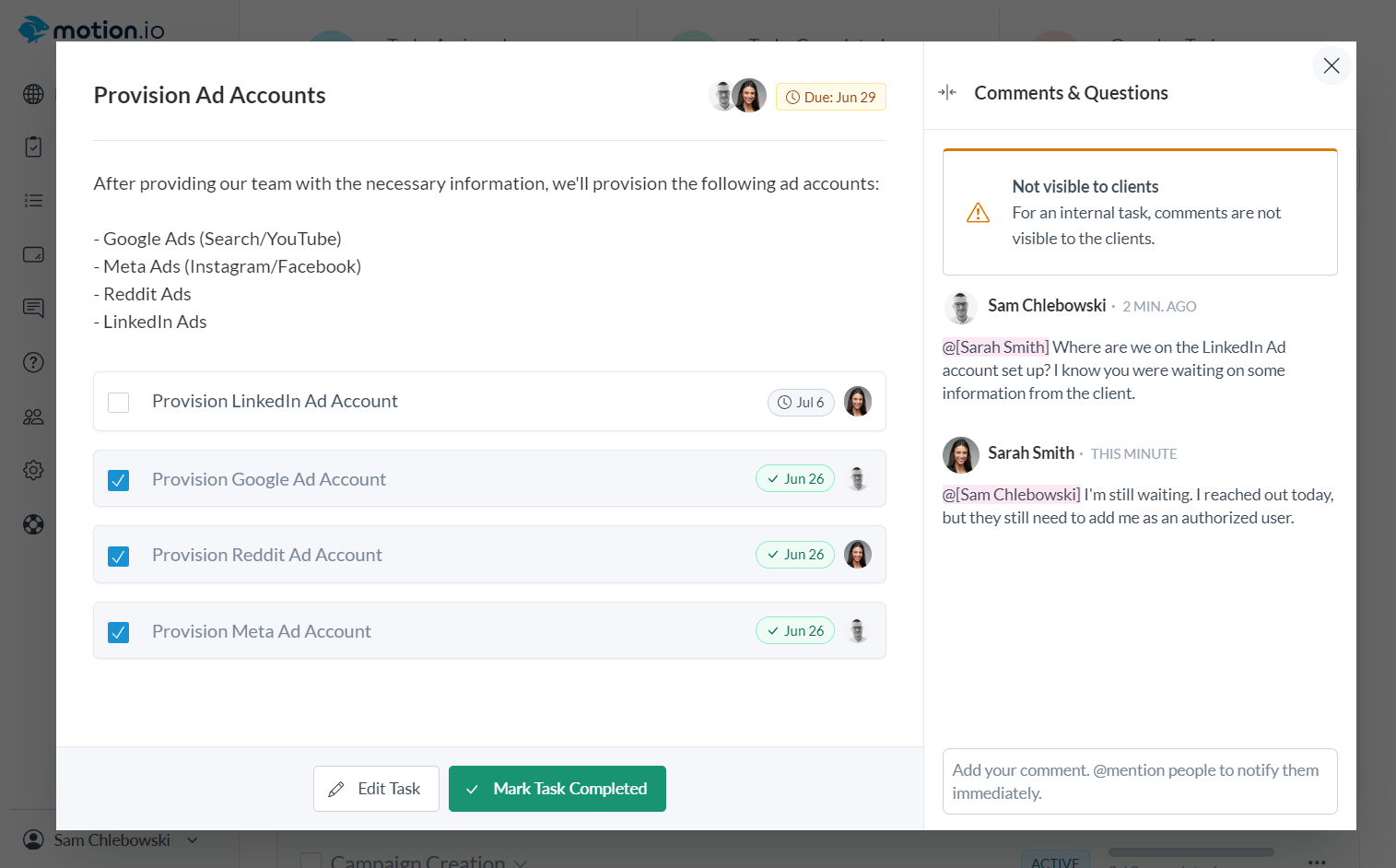 Instead of using separate platforms for client-facing and internal team collaboration, Motion.io's Team Tasks are internal tasks that empower your team to manage all communication, tasks, and files related to client projects in one place.