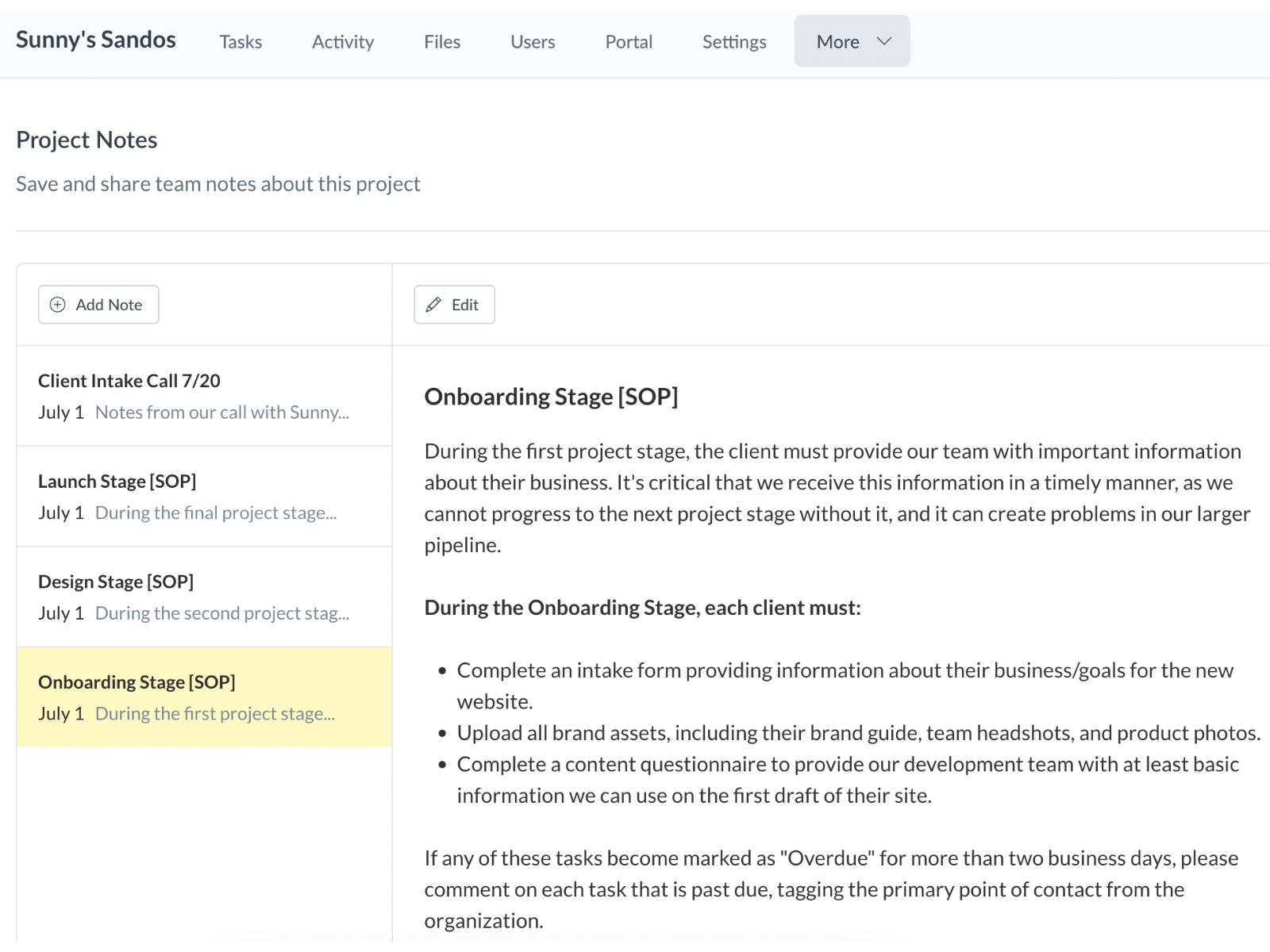 Select a project from your dashboard and click "More" from the top navigation. Select "Notes" from the dropdown and click "Add Note." After giving the note a title and entering the information you want to include, click "Save."