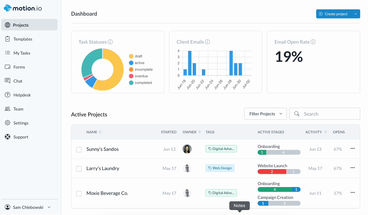 This article will explain a few options for using Project Notes and detail how you and your team can add notes to both active projects and project templates in Motion.io that remain entirely hidden from clients.